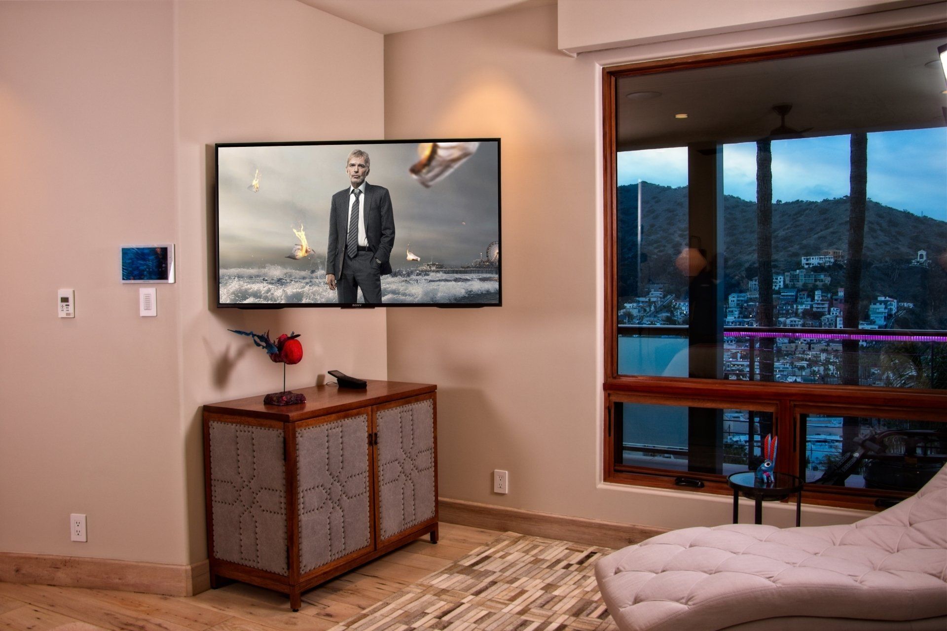 Upstairs: we have a Living Room and Kitchen, the kitchen has a full motion motorized articulating mount controlled by Crestron.
