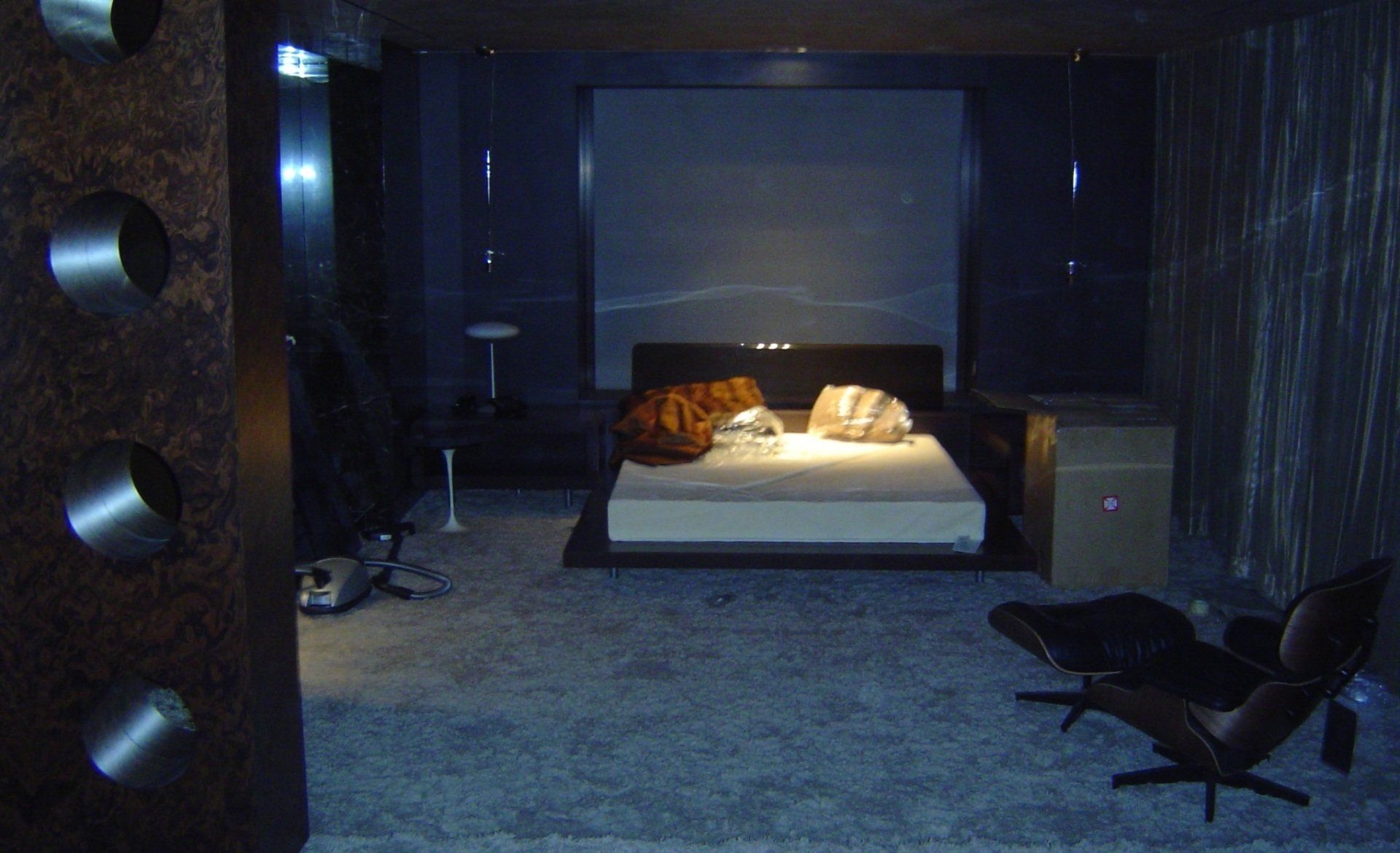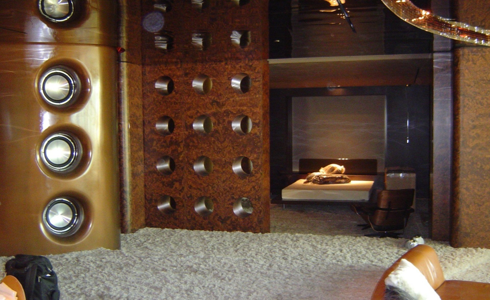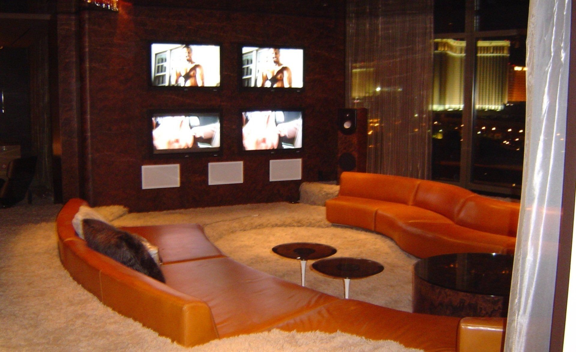 This is one of our older jobs but was far ahead of its time. Its a challenge making a players penthouse in Las Vegas but we equipped this home with several incredible features like a motorized mount that flips down the master bedroom TV. We installed a bio-metric thumbprint scanner to open doors. The 8-foot-tall speakers in the entertainment center have built-in, custom subwoofers. Ten years later we upgraded from monitors to a 2X2 video wall controlled with ease from an iPad.